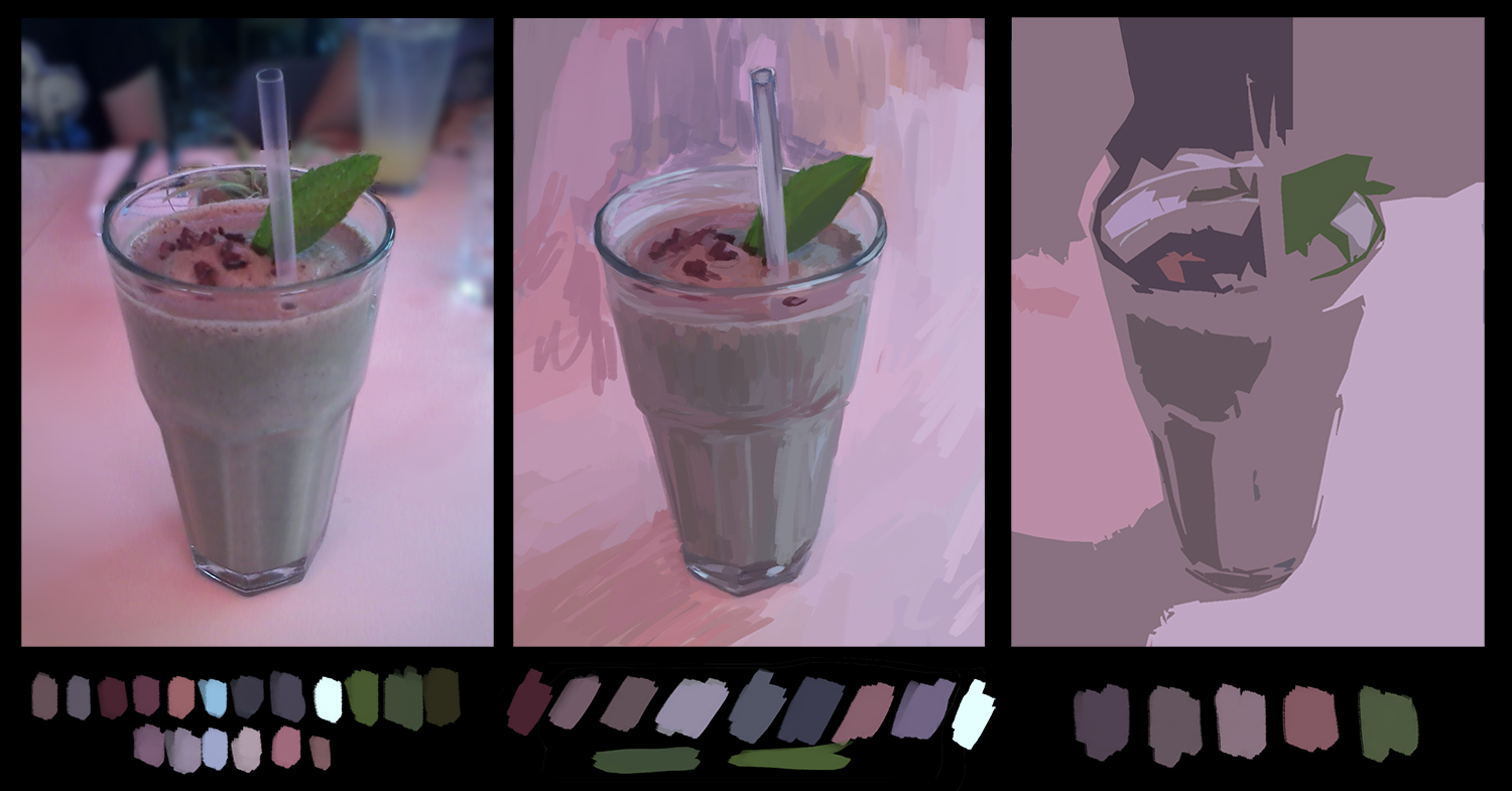 I did a quick study for the night. It's a delicious coconut mint chocolate chip smoothie I drank at a vegetarian restaurant! The first one is the original photo I used as reference for the middle and last painting. I just used the color picker tool (I really shouldn't though) to see what colors I had to work with and then chose a few colors to use for the middle and last painting. Painting the middle one was harder than I thought.